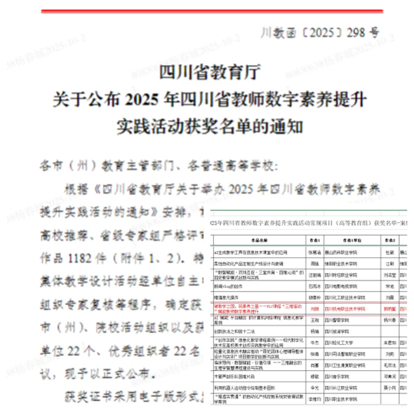 (自动化学院 刘颜)近日,四川省教育厅公布了2025年四川省教师数字素养提升实践活动评选结果。我校自动化学院刘颜、郭炳鳌、杨静团队申报的案例《破教学之困,筑素养之基——PLC课程“三维驱动”赋能教师数字素养提升》,荣获二等奖。