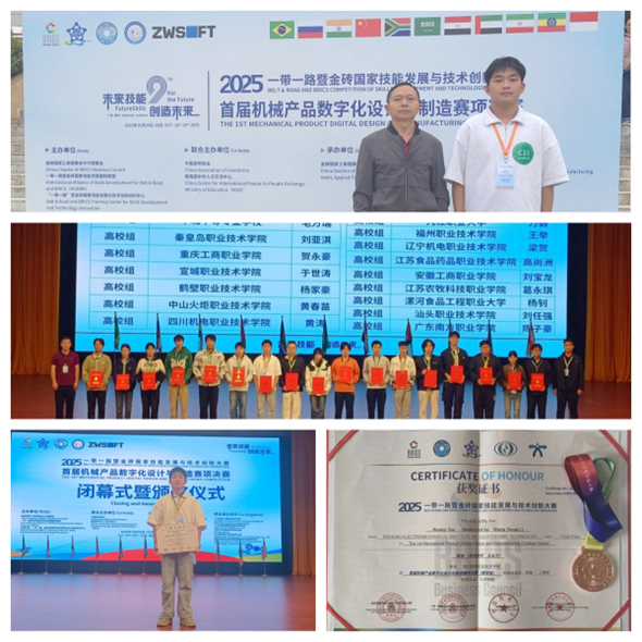 (智能制造学院吴守明)日前,2025年一带一路暨金砖国家技能发展与技术创新全国总决赛落下帷幕。学校智能制造学院机电一体化专业学生黄涛在机械产品数字化设计与制造赛项斩获三等奖。
