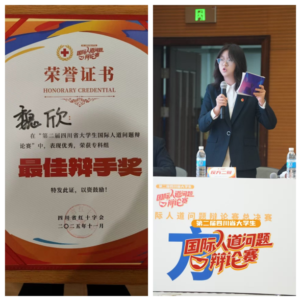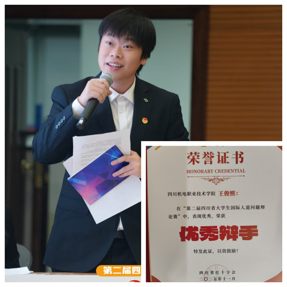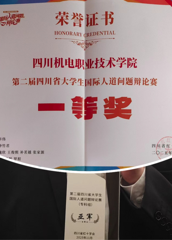 (学生工作处钟竹君、综合管理部马琪)11月16日,第二届四川省大学生国际人道问题辩论赛总决赛在四川日报报业集团圆满落幕。学校学生辩论队凭借扎实的辩论功底、敏锐的思辨能力和默契的团队协作,最终斩获专科组全省总决赛亚军,荣获赛事一等奖, 2024级数字多媒体技术专业9班魏欣凭荣膺大赛最佳辩手,2024级汽车检测与维修技术6班王俊熙收获大赛优秀辩手奖,指导老师钟竹君获得优秀教练员称号,实现团体与个人荣誉的双重丰收,尽显机电学子卓越风采!