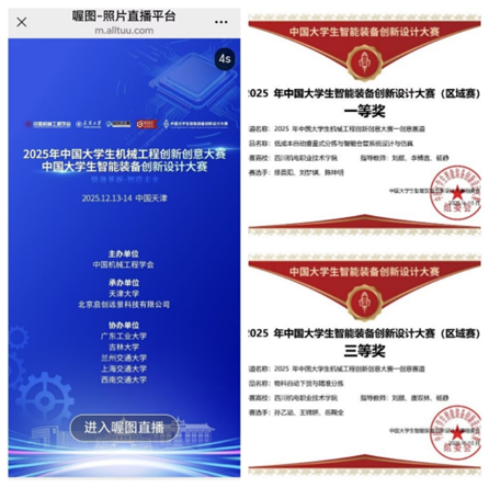 (自动化学院刘颜、综合管理部马琪)日前,从2025年中国大学生智能装备创新设计大赛组委会传来好消息,由自动化学院刘颜、唐双林、李镈言、姜洪训、杨静等教师指导的2支学生技能竞赛团队,分别在区域赛和全国总决赛中斩获佳绩。其中,2024级供电专业6班缪晨阳、刘梦琪和2024级机器人应用专业6班陈坤明团队凭借扎实的专业功底、创新的设计思维及稳定的现场发挥,一路过关斩将,最终夺得国家级一等奖。